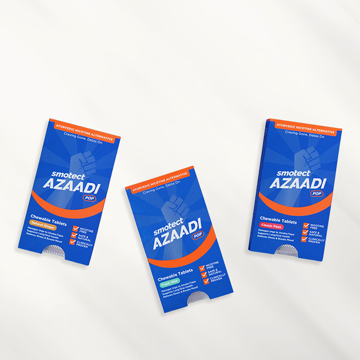 Smotect Azaadi is the world’s first clinically proven Ayurvedic Nicotine Alternative, crafted into chewable tablets with refreshing flavors. It helps manage cravings instantly, that too nicotine-free - without restlessness, anxiety or withdrawal symptoms. We know quitting tobacco isn’t easy, that’s why Azaadi products are built for your pace - pop a chewable tablet when cravings strike and see it go away instantly, no pressure. No guilt. Just a smarter, cleaner way forward.