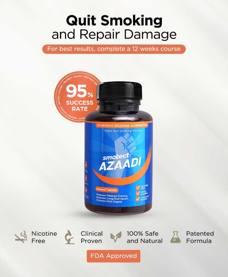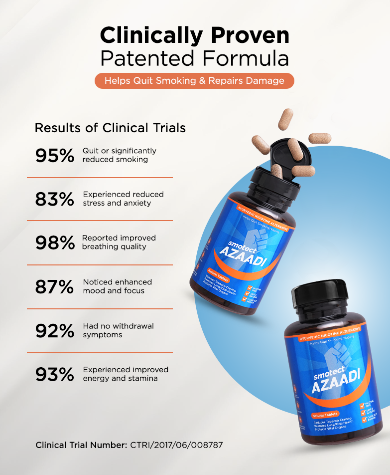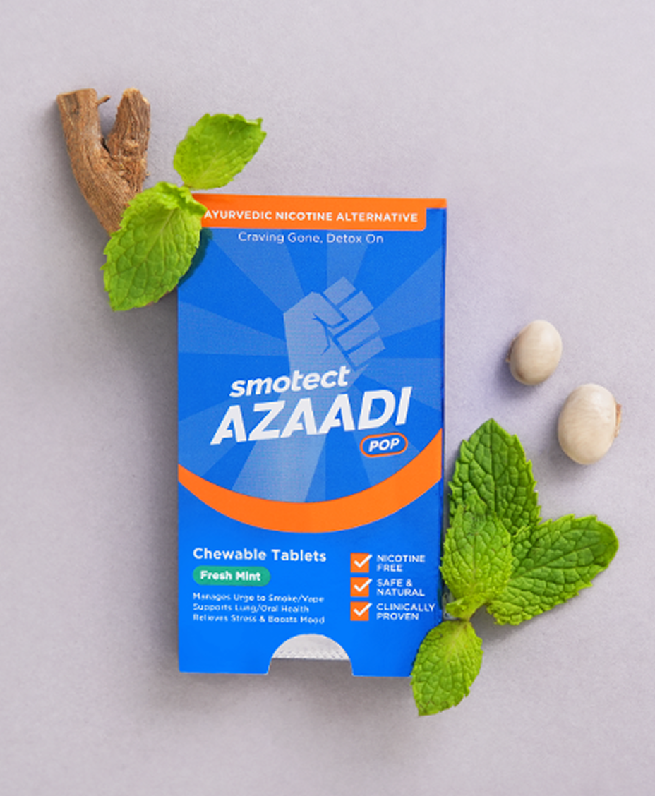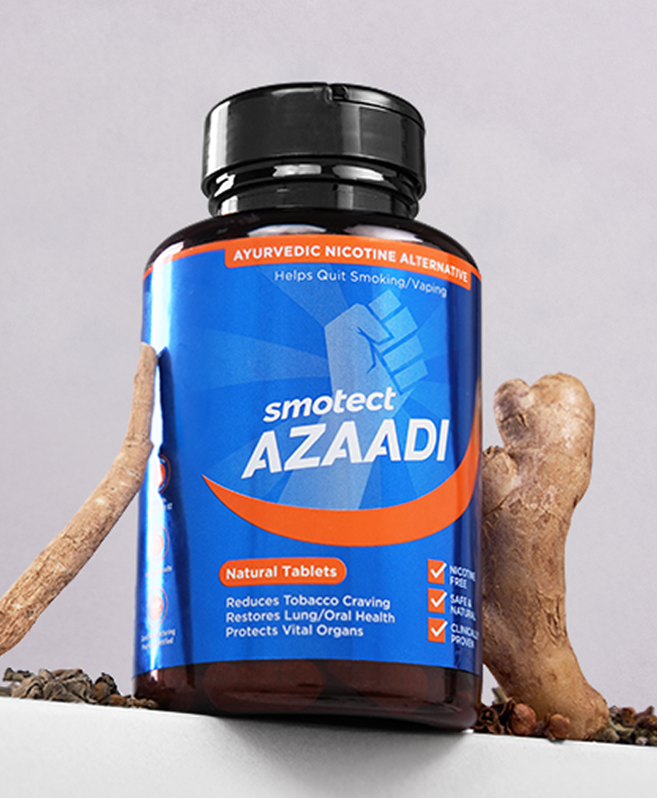 Smotect Azaadi is the world’s first clinically proven Ayurvedic Nicotine Alternative, crafted into oral tablets. It helps manage cravings, supports vital organs and prepares your body for a nicotine-free life - without restlessness, anxiety or withdrawal symptoms.