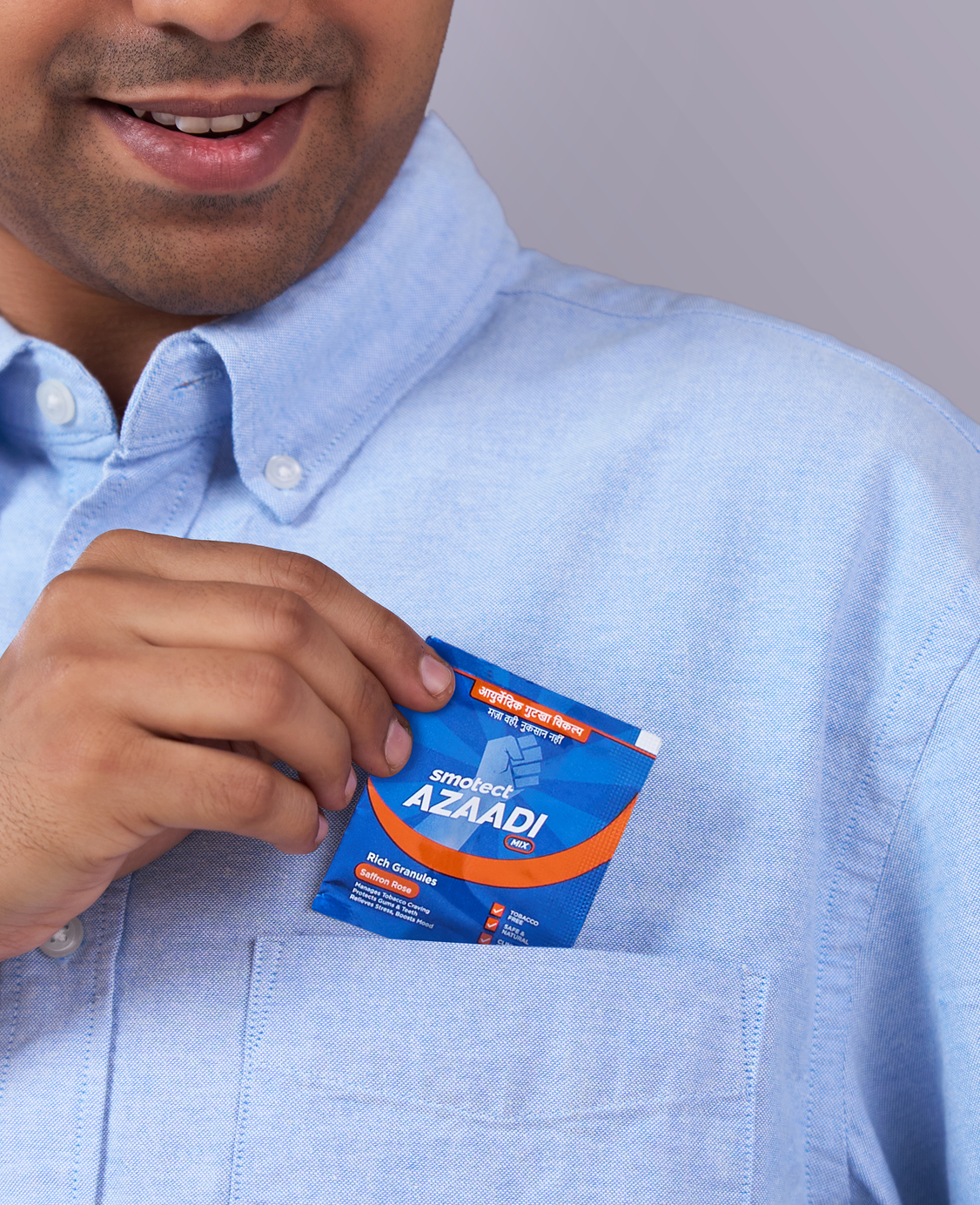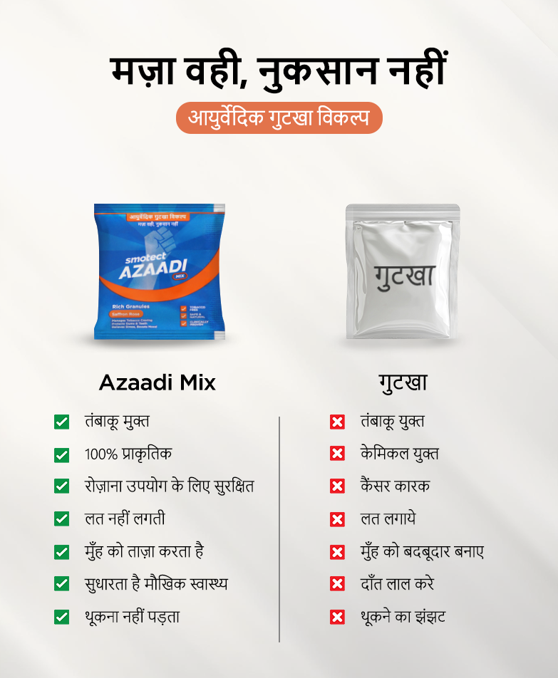 गुटखे जैसा वही स्वाद और चबाने का अनुभव, लेकिन बिना तंबाकू और बिना नुकसान के। बस Azaadi Mix चबाइए और पाएँ—न पीले दाँत, न थूकने की झंझट, न बदबूदार साँस।