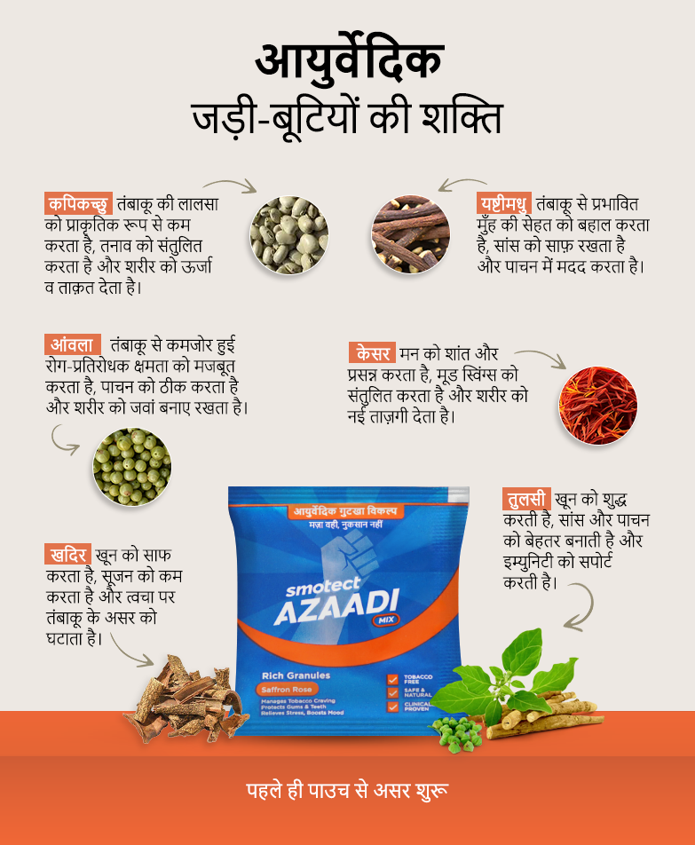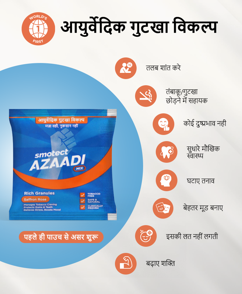 Azaadi Mix दुनिया का पहला आयुर्वेदिक गुटखा विकल्प है। यह शक्तिशाली जड़ी-बूटियों से बना है, जो आपकी तलब को तुरंत नियंत्रित करता है, मौखिक स्वास्थ्य और स्वच्छता को बेहतर बनाता है और सबसे अहम—इसे थूकने की ज़रूरत नहीं होती।