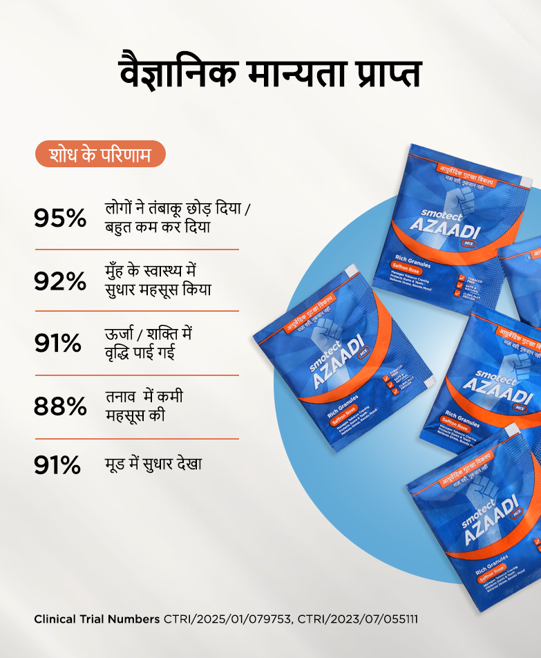 Backed by science and powered by Ayurveda, Azaadi Mix offers a nicotine-free, clinically-tested solution to help you quit Tobacco or Gutkha naturally.