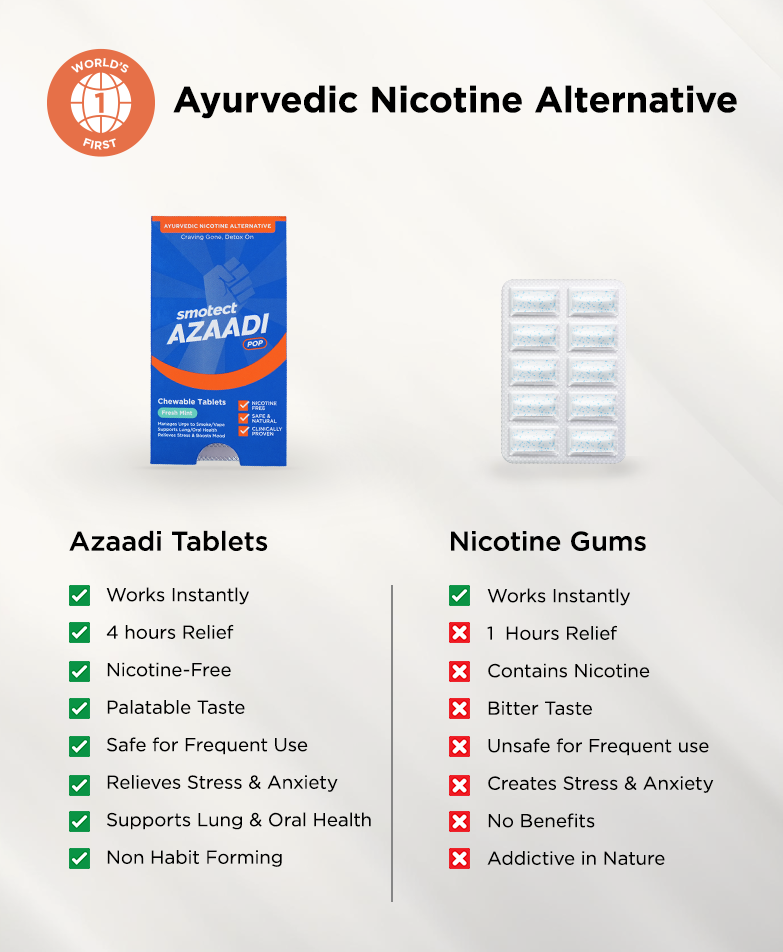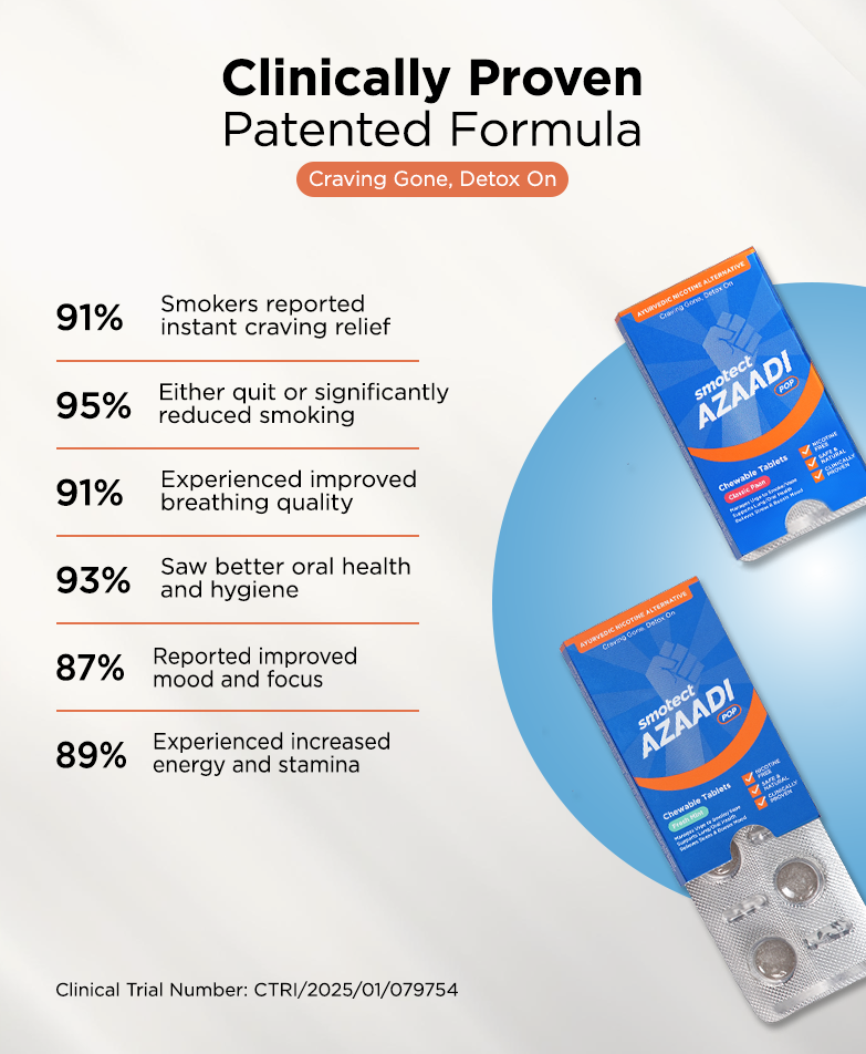 Backed by science and powered by Ayurveda, Smotect Azaadi offers a nicotine-free, clinically-tested solution to help you quit smoking/vaping or gutkha naturally.